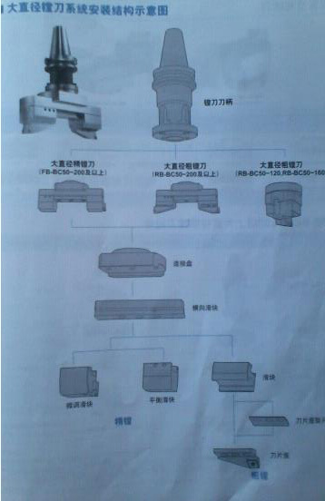 大直徑粗鏜刀:由鏜刀刀柄BC50+連接盤BR200+橫向滑板RST200/300/400+滑塊RS200+刀片座墊片RS201+刀片座RB200C12組成