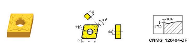 CNMG090304-DF(YBC151):高耐磨性的基體與MT-TiCN、厚Al2O3、TiN涂層的組合;是鋼、鑄鋼和不銹鋼材料精加工在高速切削條件下的理想牌號(hào);