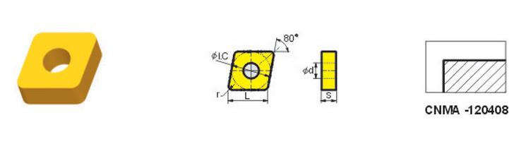 CNMG120404(YBD151):高耐磨性基體與MT-Ti(CN)、厚Al2O3、TiN 涂層的極佳組合,是球墨鑄鐵與灰口鑄鐵加工的首選牌號,允許有較高的切削速度。